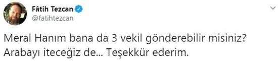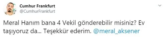 Ahmet Davutoğlu'nun 'Gelecek Partisi' ile ilgili olarak sorulan "20 milletvekili verecek misiniz?" sorusuna "Benden 20 milletvekili isteseler veririm" cevabını veren Meral Akşener, sosyal medyada dalga konusu oldu. Twitter kullanıcılarının kimi halay için, kimi okey için, kimiyse arabasını itmek için Akşener'den vekil istedi.