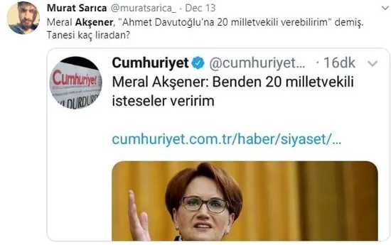 Akşener'in siyaset kanadında tepkiyle karşılanan ifadeleri sosyal medyanın da gündemindeydi. Sosyal medya kullanıcıları Meral Akşener'in "Benden 20 milletvekili isteseler veririm" açıklaması ile adeta dalga geçti. İşte sosyal medyadaki o yorumlar:
