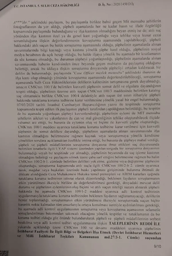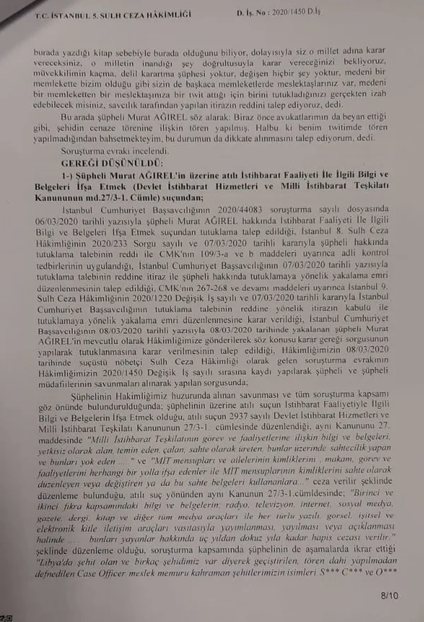 İstanbul Cumhuriyet Başsavcılığı’nın; sahte belge üretenlere resmi belgede sahtecilik soruşturması başlattığı öğrenildi. İstanbul 5. Sulh Ceza Hakimliği’nin; MİT şehidinin ifşa edilmesi soruşturmasında tutuklanan Yeniçağ Gazetesi yazarı Murat Ağırel hakkında hem “tutuklama”, hem de “serbest bırakma” kararının verildiğine yönelik haberler tamamen yalan olduğu ortaya çıktı. İstanbul 5. Sulh Ceza Mahkemesi’nin Murat Ağırel hakkında tutuklamaya yönelik karar metni 10 sayfadan oluşuyor. Mahkemenin 10 sayfalık kararında; Murat Ağırel’in serbest bırakılmasına yönelik hiçbir kelime yer almıyor.