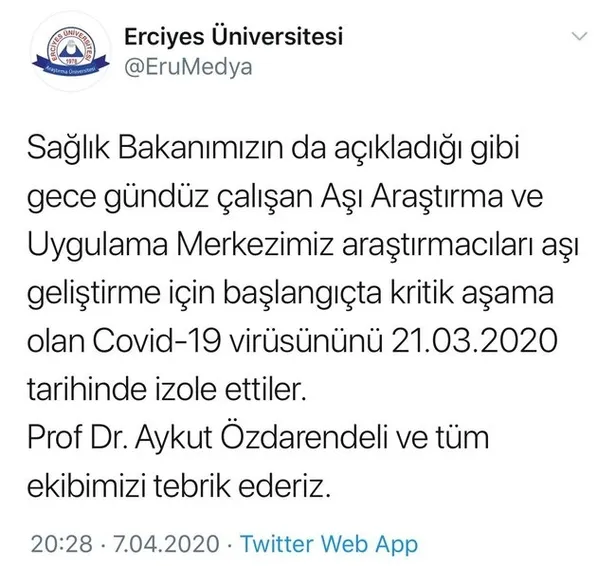 Erciyes Üniversitesi (ERÜ) Rektörü Prof. Dr. Mustafa Çalış, resmi sosyal medya hesabından "Sağlık Bakanımızın da açıkladığı gibi gece gündüz çalışan Aşı Araştırma ve Uygulama Merkezimiz araştırmacıları aşı geliştirme için başlangıçta kritik aşama olan Kovid-19 virüsününü 21 Mart 2020 tarihinde izole ettiler. Prof Dr. Aykut Özdarendeli ve tüm ekibimizi tebrik ederiz" dedi.