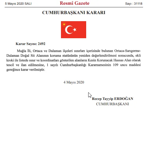 4 Mayıs 2020 tarihinde Resmî Gazetede yayınlanan 2492 sayılı Cumhurbaşkanı Kararı'nda şöyle denildi: "Muğla ili ortaca ve Dalaman İlçeleri sınırları içerisinde bulunan Ortaca-Sarıgerme-Dalaman Doğal Sit Alanının koruma statüsünün yeniden değerlendirilmesi sonucunda, ekli kroki ile listede sınır ve koordinatları gösterilen alanların Kesin Korunacak Hassas Alan olarak tescil ve ilan edilmesine 1 sayılı Cumhurbaşkanlığı Kararnamesinin 109'uncu maddesi gereğince karar verilmiştir." (Sabah)