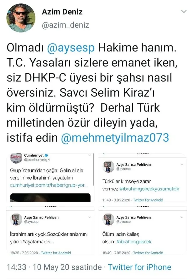 HSK Başkan Vekili Mehmet Yılmaz'ın Twitter hesabını mesajına etiketleyen Aziz Deniz isimli sosyal medya kullanıcısı şunları yazdı: Olmadı hâkime hanım. T.C yasaları sizlere emanet iken, siz DHKP-C üyesi bir şahsı nasıl översiniz? Savcı Selim Kiraz'ı kim öldürmüştü? Derhal Türk milletinden özür dileyin ya da istifa edin!