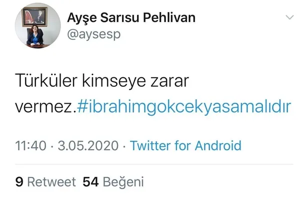Yine aynı gün İbrahim Gökçek adına açılan hastagi etiketleyerek "Ölüm adın kalleş olsun" mesajını paylaştı. Aynı zamanda Yargıçlar Sendikası Başkanı da olan Pehlivan, 3 Mayıs günü ise #İbrahimGökçekYaşamalıdır hastagini etiketliyerek "türküler hiç kimseye zarar vermez" iletisini atmış.