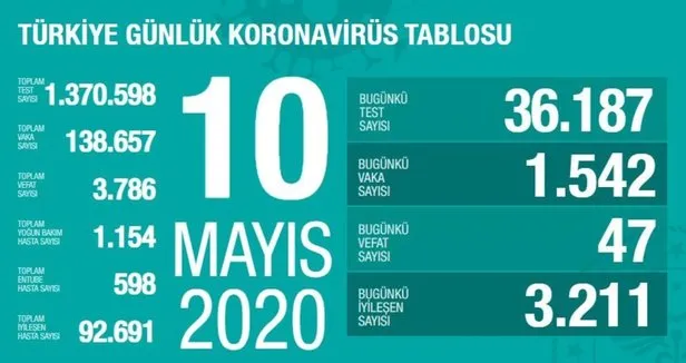Son dakika haberine göre, Sağlık Bakanı Fahrettin Koca Twitter üzerinden 10 Mayıs koronavirüs vaka, iyileşen ve vefat sayılarını içeren tabloyu paylaştı. Türkiye'de son 24 saatte 1542 kişiye Kovid-19 tanısı kondu, 47 kişi hayatını kaybetti, toplam vaka sayısı 138 bin 657, can kaybı 3 bin 786, iyileşen hasta sayısı 92 bin 691 oldu.