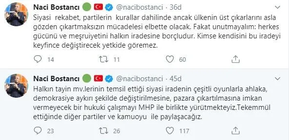 Halkın tayin ettiği Milletvekillerinin temsil ettiği siyasi iradenin çeşitli oyunlarla; ahlaka, demokrasiye aykırı şekilde değiştirilmesine, pazara çıkartılmasına imkan vermeyecek bir hukuki çalışmayı MHP ile birlikte yürütmekteyiz. Tekemmül ettiğinde diğer partiler ve kamuoyu ile paylaşacağız.