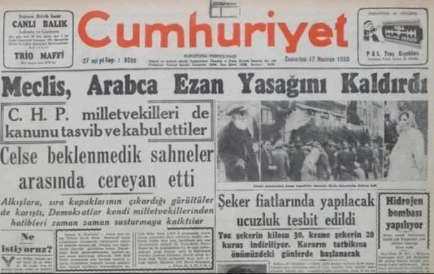 Yasağın kaldırılmasıyla ilgili 70 yıldır çiğnenen bir sakız var. Efendim, CHP karşı çıkmamış, hatta desteklemiş!.. Kimse kusura bakmasın ama bu biraz, Firavunun; ölümü görünce iman etmesine benziyor. 69 milletvekili ile karşı çıksa ne olacaktı ki? Ayrıca CHP madem ezan yasağını kaldırmayı bu kadar istiyormuş da neden DP'nin iktidara gelmesini beklemiş!