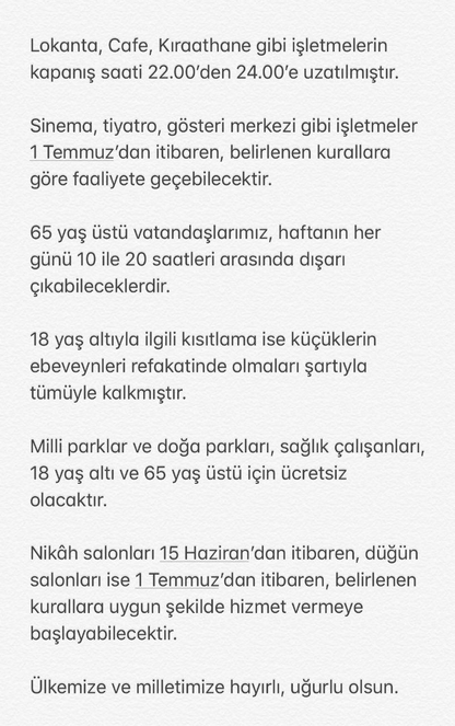 Lokanta, kafe, kıraathane gibi işletmelerin kapanış saati 22.00'den 24.00'e uzatılmıştır.