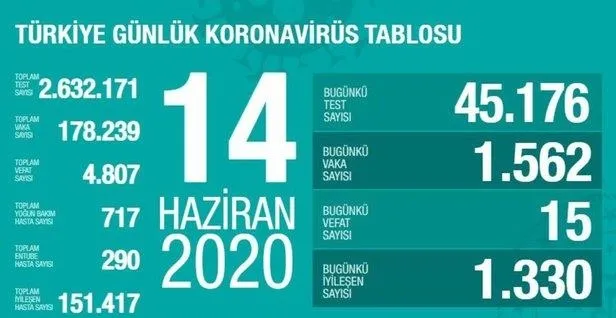 Sağlık Bakanlığı, dün 15 hastanın vefat ettiğini, yeni vaka sayısının ise 1562 olduğunu açıkladı. Toplam iyileşen hasta sayısı da 151 bin 417'ye yükseldi.
