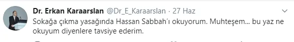 Öte yandan Karaarslan'ın 27 Haziran'da yaptığı paylaşımda FETÖ'nün ilham kaynağı olan Hasan Sabbah'ı övmesi ise dikkatlerden kaçmadı.