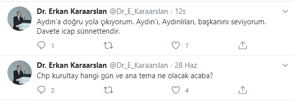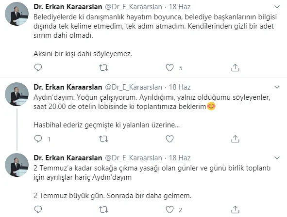 Karaarslan'ın Twitter hesabından yaptığı paylaşımda "Aydın'dayım. Yoğun çalışıyorum. Ayrıldığımı, yalnız olduğumu söyleyenler, saat 20.00 de otelin lobisinde ki toplantımıza beklerim" ifadeleri hain terör örgütü FETÖ'nün içten içe ülkeyi bölme çalışmalarını bir kez daha gözler önüne serdi.