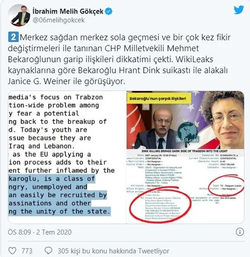 Merkez sağdan merkez sola geçmesi ve bir çok kez fikir değiştirmeleri ile tanınan CHP Milletvekili Mehmet Bekaroğlunun garip ilişkileri dikkatimi çekti. WikiLeaks kaynaklarına göre Bekaroğlu Hrant Dink suikastı ile alakalı Janice G. Weiner ile görüşüyor.