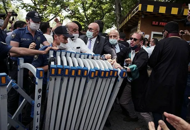 Son dakika haberi... Baroların demokratikleşmesine karşı olan avukatlar, yasağa rağmen eylemlerine devam ederken CHP'nin provokasyonlarıyla ünlü milletvekili Mahmut Tanal da eylemlere katılarak polis barikatlarını yıktı.