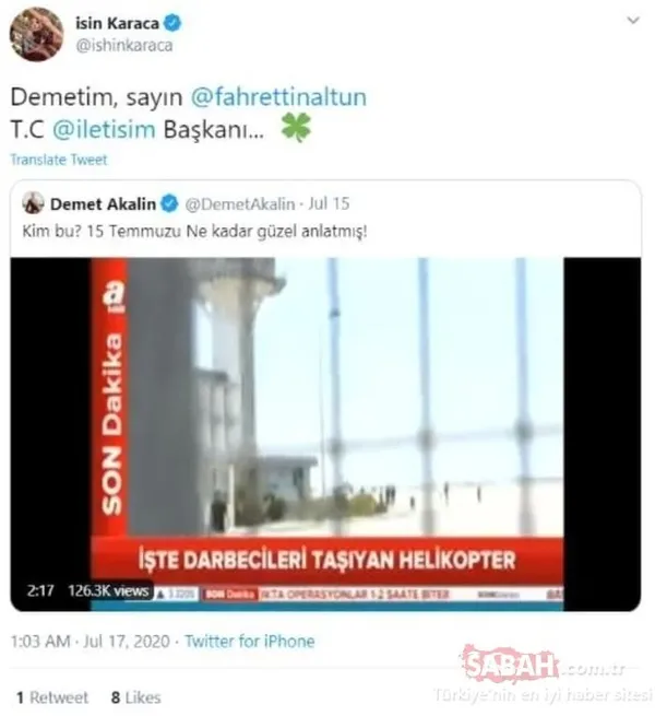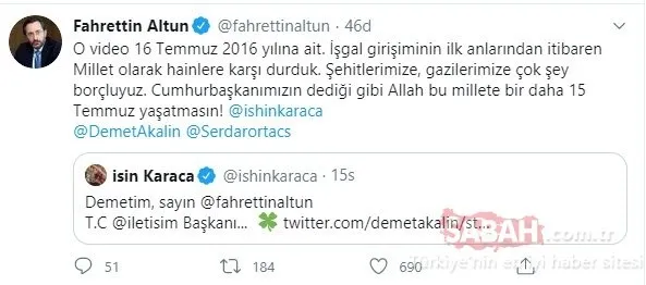 İletişim Başkanı Prof. Dr. Fahrettin Altun attığı tweet ile Demet Akalın, Işın Karaca ve Serdar Ortaç'a şu sözlerle yanıt verdi: "O video 16 Temmuz 2016 yılına ait. İşgal girişiminin ilk anlarından itibaren Millet olarak hainlere karşı durduk. Şehitlerimize, gazilerimize çok şey borçluyuz. Cumhurbaşkanımızın dediği gibi Allah bu millete bir daha 15 Temmuz yaşatmasın!