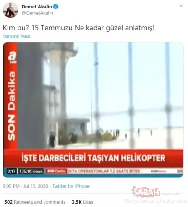 Sanatçı Demet Akalın, FETÖ'nün 15 Temmuz 2016'daki hain darbe girişimine ilişkin bir video paylaşmış ve "Kim bu? 15 Temmuz'u ne kadar güzel anlatmış!" sorusunu sormuştu.
