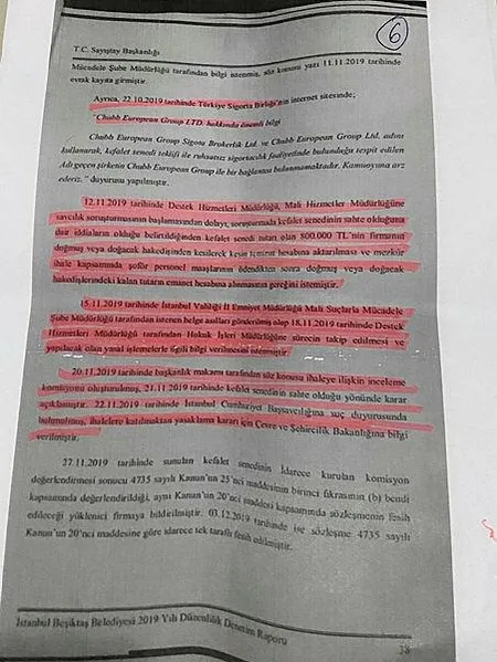 Beşiktaş Belediyesi bünyesindeki Destek Hizmetleri Müdürlüğü, 12 Kasım'da Mali Hizmetler Müdürlüğü'ne söz konusu teminat senedinin sahte olabileceğine dair iddiaların bulunduğunu belirterek kefalet senedi tutarı olan 800 bin TL'nin firmanın doğmuş ve doğacak hakedişlerinden kesilmesini istedi. 20 Kasım'da ise Başkanlık Makamı, ihalenin incelenmesi için komisyon kurulmasına karar verdi. Bu süreçte söz konusu kefalet senedinin sahte olduğu da kesinleşti.