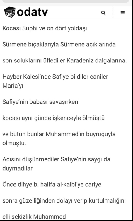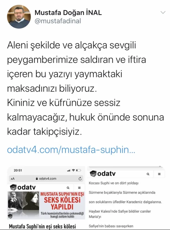 Oda TV; Peygamberimiz Hz. Muhammed ve eşine ağır hakaret yazıyı alıntıladı. Oda TV'nin manşetten verdiği haberde; "Mustafa Suphi'nin eşi seks kölesi yapıldı. Türk komünistlerinin çekmediği hangi zulüm kaldı" ifadeleri kullanıldı.