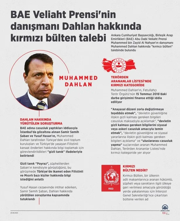 Ankara Cumhuriyet Başsavcılığı, BAE Abu Dabi Veliaht Prensi Muhammed bin Zayid Al Nahyan'ın danışmanı Muhammed Dahlan hakkında "kırmızı bülten" talebinde bulundu.