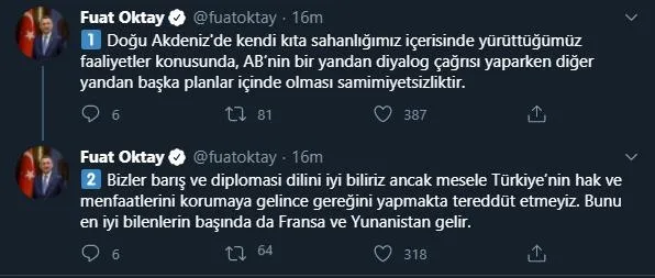 "Doğu Akdeniz'de kendi kıta sahanlığımız içerisinde yürüttüğümüz faaliyetler konusunda, AB'nin bir yandan diyalog çağrısı yaparken diğer yandan başka planlar içinde olması samimiyetsizliktir. Bizler barış ve diplomasi dilini iyi biliriz ancak mesele Türkiye'nin hak ve menfaatlerini korumaya gelince gereğini yapmakta tereddüt etmeyiz. Bunu en iyi bilenlerin başında da Fransa ve Yunanistan gelir."