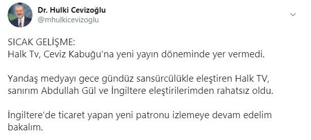 Hulki Cevizoğlu, yaptığı paylaşımda "Sıcak gelişme" diyerek Halk TV'nin kararını şöyle uyurdu: