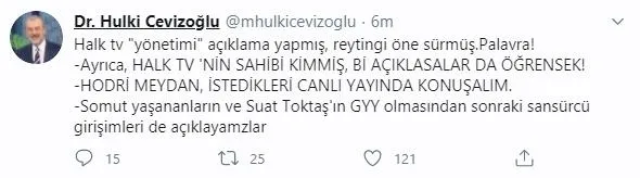 Cevizoğlu, Halk TV'nin açıklamasından sonra attığı tweette "Halk tv "yönetimi" açıklama yapmış, reytingi öne sürmüş. Palavra! Ayrıca, HALK TV 'nin sahibi kimmiş, bi açıklasalar da öğrensek! Hodri meydan, istedikleri canlı yayında konuşalım. Somut yaşananların ve Suat Toktaş'ın GYY olmasından sonraki sansürcü girişimleri de açıklayamazlar" dedi.