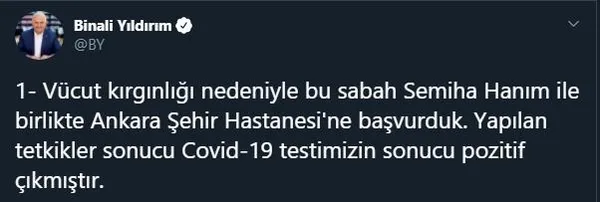 Binali Yıldırım, Twitter hesabından yaptığı paylaşımda, eşi Semiha Yıldırım ile başvurduğu Ankara Şehir Hastanesinde yapılan Kovid-19 testinin pozitif çıktığını açıklamış, durumunun iyi olduğunu bildirmişti.