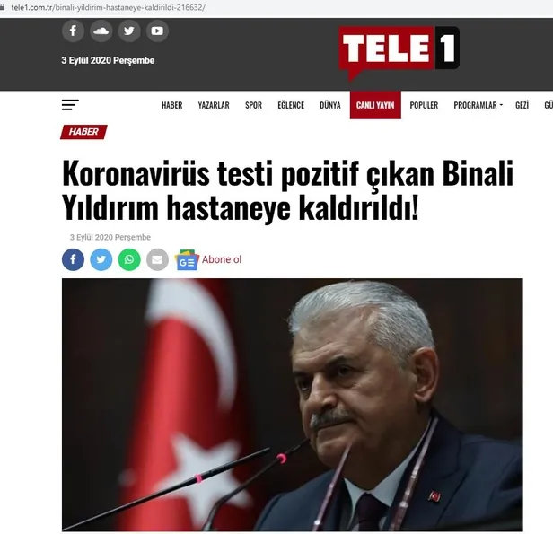 Son dakika haberine göre, Eski Başbakan ve AK Parti İzmir Milletvekili Binali Yıldırım sosyal medya hesabından, "Vücut kırgınlığı nedeniyle bu sabah Semiha Hanım ile birlikte Ankara Şehir Hastanesi'ne başvurduk. Yapılan tetkikler sonucu Covid-19 testimizin sonucu pozitif çıkmıştır." açıklamasında bulundu. Yıldırım'ın açıklamasının ardından CHP medyasının 'Binali Yıldırım hastaneye kaldırıldı' yalanı da ortaya çıkmış oldu.