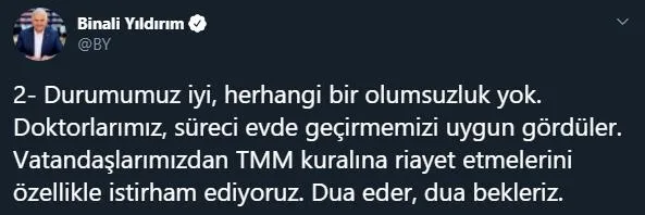 "Yapılan tetkikler sonucu Kovid-19 testimizin sonucu pozitif çıktı" bilgisini paylaşan Yıldırım, "Durumumuz iyi, herhangi bir olumsuzluk yok. Doktorlarımız, süreci evde geçirmemizi uygun gördüler. Vatandaşlarımızdan TMM kuralına riayet etmelerini özellikle istirham ediyoruz. Dua eder, dua bekleriz." ifadelerini kullandı.