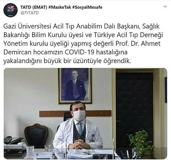 TATD'nın Twitter hesabından yapılan açıklamada, "Gazi Üniversitesi Acil Tıp Anabilim Dalı Başkanı, Sağlık Bakanlığı Bilim Kurulu üyesi ve Türkiye Acil Tıp Derneği Yönetim kurulu üyeliği yapmış değerli Prof. Dr. Ahmet Demircan hocamızın Covid-19 hastalığına yakalandığını büyük bir üzüntüyle öğrendik. Tedavisi devam eden hocamıza acil şifalar diliyor, en kısa sürede tekrar sağlıkla aramızda görmeyi umut ediyoruz" denildi.