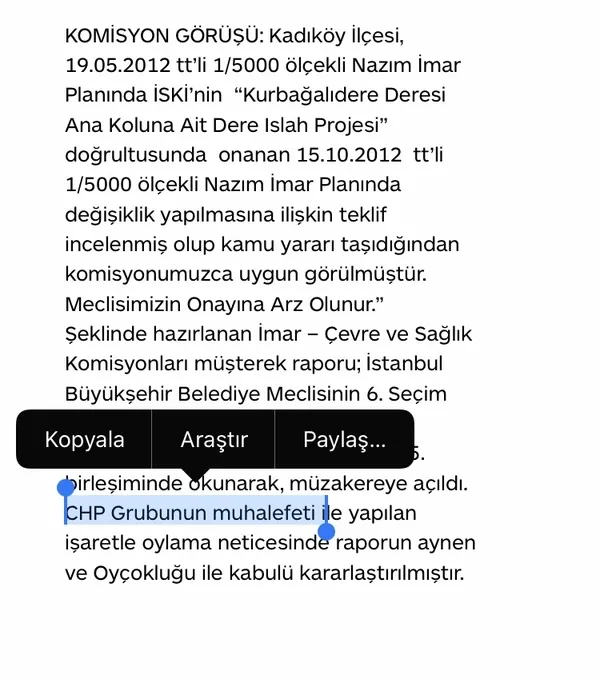 AK Partili İBB, 12 Nisan 2013'te İSKİ'nin Kadıköy ilçesinde bulunan Kurbağalıdere Deresi Ana Koluna Ait Dere Islah Projesi'ni İBB Meclisi'ne sundu. CHP'li İBB Meclis üyeleri ıslah projesine ret oyu verdi. Kararda, "12 Nisan 2013 tarihli 5. birleşiminde okunarak, müzakereye açıldı. CHP Grubunun muhalefetiyle yapılan işaretle oylama neticesinde raporun aynen ve oyçokluğu ile kabulü kararlaştırılmıştır" denildi.