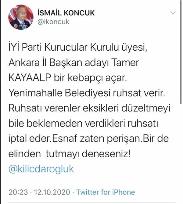 Koncuk, "İYİ Parti Kurucular Kurulu üyesi, Ankara İl Başkan adayı Tamer Kayaalp bir kebapçı açar. Yenimahalle Belediyesi ruhsat verir. Ruhsatı verenler eksikleri düzeltmeyi bile beklemeden verdikleri ruhsatı iptal eder. Esnaf zaten perişan.. Bir de elinden tutmayı deneseniz!" ifadelerini kullandı.