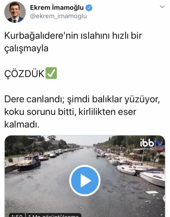 İstanbul Büyükşehir Belediyesi Başkanı Ekrem İmamoğlu; "Kurbağalıdere'nin ıslahını hızlı bir çalışmayla çözdük. Dere canlandı. Şimdi balıklar yüzüyor, koku sorunu bitti, kirlilikten eser kalmadı" açıklamasında bulunmuş ve derenin kendi yönetimleri tarafından temizlendiğini öne sürmüştü.