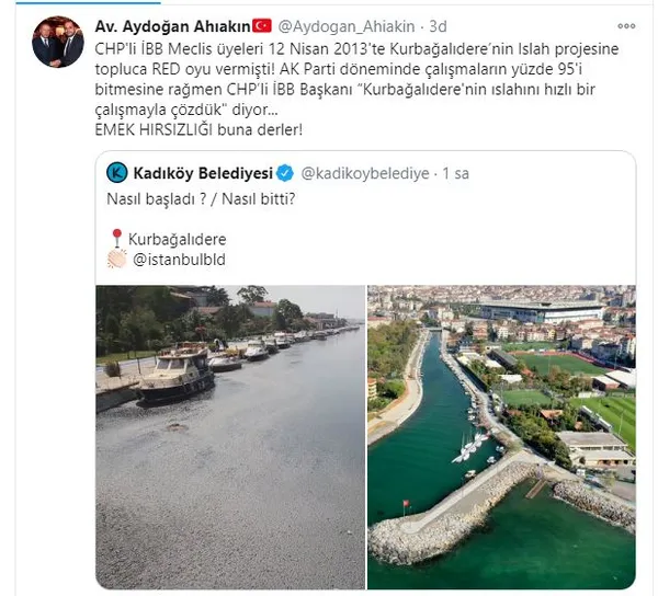 Aydoğan Ahıkan, söz konusu paylaşımına Kadıköy Belediyesi'nin "Nasıl başladı?/Nasıl bitti? Kurbağalıdere" paylaşımını da etiketledi.