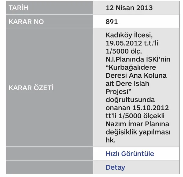 AK Partili İBB, 12 Nisan 2013'te İSKİ'nin Kadıköy ilçesinde bulunan Kurbağalıdere Deresi Ana Koluna Ait Dere Islah Projesi'ni İBB Meclisi'ne sundu. CHP'li İBB Meclis üyeleri ıslah projesine ret oyu verdi. Kararda, "12 Nisan 2013 tarihli 5. birleşiminde okunarak, müzakereye açıldı. CHP Grubunun muhalefetiyle yapılan işaretle oylama neticesinde raporun aynen ve oyçokluğu ile kabulü kararlaştırılmıştır" denildi.