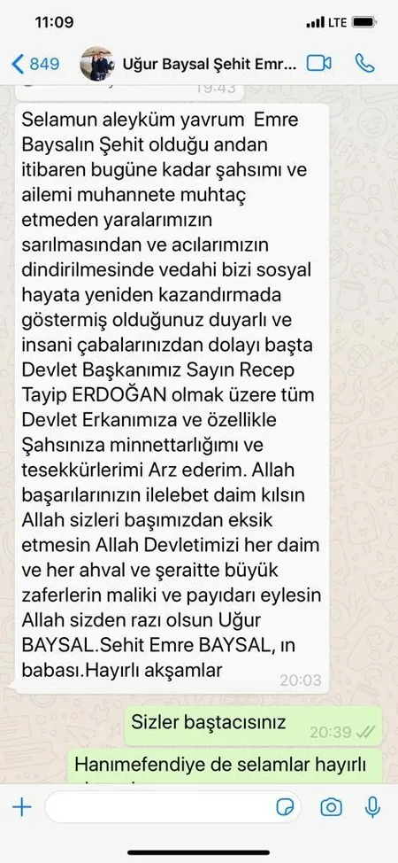 Emre Baysal'ın şehit olduğu andan itibaren bugüne kadar şahsımı ve ailemi muhannete muhtaç etmeden yaralarımızın sarılmasından ve acılarımızın dindirilmesinde ve dahi bizi sosyal hayata yeniden kazandırmada göstermiş olduğunuz duyarlı ve insani çabalarınızdan dolayı başta devlet başkanımız Sayın Recep Tayip Erdoğan olmak üzere tüm devlet erkanımıza ve özellikle şahsınıza minnettarlığımı ve teşekkürlerimi Arz ederim. Allah başarılarınızın ilelebet daim kılsın. Allah sizleri başımızdan eksik etmesin. Allah devletimizi her daim ve her ahval ve şeraitte büyük zaferlerin maliki ve payıdarı eylesin. Allah sizden razı olsun. Uğur Baysal. Şehid Emre Baysal'ın babası. Hayırlı akşamlar" dedi.