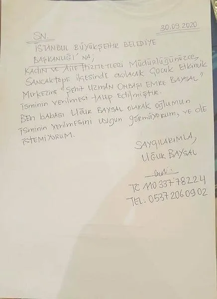"Şehidimizin Babası Uğur Baysal Beyefendi, şehit oğlunun isminin İBB tarafından kullanılması konusunda olumlu bir yaklaşım içinde değildir. Bizzat şehidimizin babası Uğur Baysal'ın el yazısıyla kaleme aldığı dilekçe mevcuttur. Bu dilekçe İBB Yazı İşleri Müdürlüğü'nce de 2 Ekim 2020 tarihinde kayıt altına alınmış olup kayıt barkodu da elimdedir."