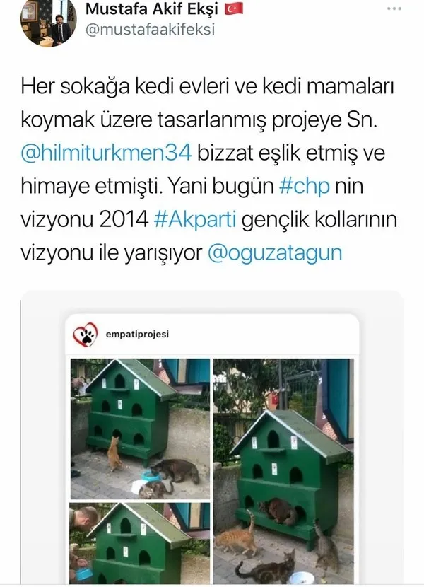 CHP'li Ekrem İmamoğlu ise yine AK Partili bir belediyeye ait sokak hayvanları için faaliyete geçirilen empati isimli projeyi sadece bir harf değiştirerek 'semtpati' adıyla kendi yeni projesi olarak açıkladı.