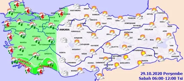 Meteoroloji Genel Müdürlüğü tarafından yapılan son dakika açıklamasına göre: Ülkemizin batı ve iç kesimlerinin parçalı ve yer yer çok bulutlu, Marmara, Ege, Batı Akdeniz, İç Anadolu'nun batısı ve Batı Karadeniz ile Aksaray, Kırşehir ve Çorum çevrelerinin sağanak ve gök gürültülü sağanak yağışlı, diğer yerlerin az bulutlu geçeceği tahmin ediliyor. Yağışların; İzmir, Aydın, Muğla ve Antalya çevreleri ile Isparta'nın güney, Burdur'un doğu ilçelerinde kuvvetli ve yer yer çok kuvvetli (30-75 kg/m2) olması bekleniyor.