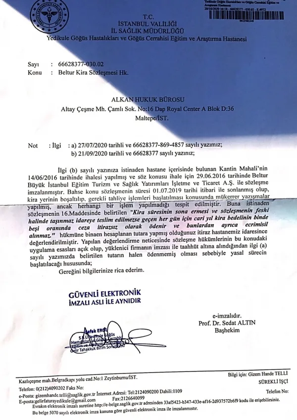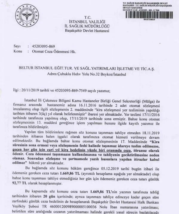 Bu durum İstanbul İl Sağlık Müdürlüğü tarafından hazırlanan sözleşme şartnamesine göre, "Kira süresinin sona ermesi ve sözleşmenin feshi halinde taşınmaz idareye teslim edilmezse geçen her gün için kira bedelinin binde 5'i oranında ceza itirazsız olarak ödenir ve bunlardan ayrıca ecrimisil alınmaz" hükmü uygulandığından BELTUR haksız işgaliyesi nedeniyle 70 milyon TL ceza ödeyecek.