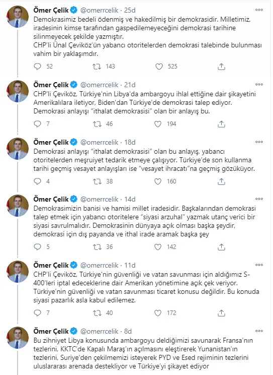 CHP'li Ünal Çeviköz'ün ABD'nin yeni başkanı Joe Biden'a yaptığı çağrıya tepki yağmaya devam ediyor. AK Parti Sözcüsü Ömer Çelik, sosyal medya üzerinden yaptığı açıklamada "CHP’li Ünal Çeviköz’ün yabancı otoritelerden demokrasi talebinde bulunması vahim bir yaklaşımdır." dedi.