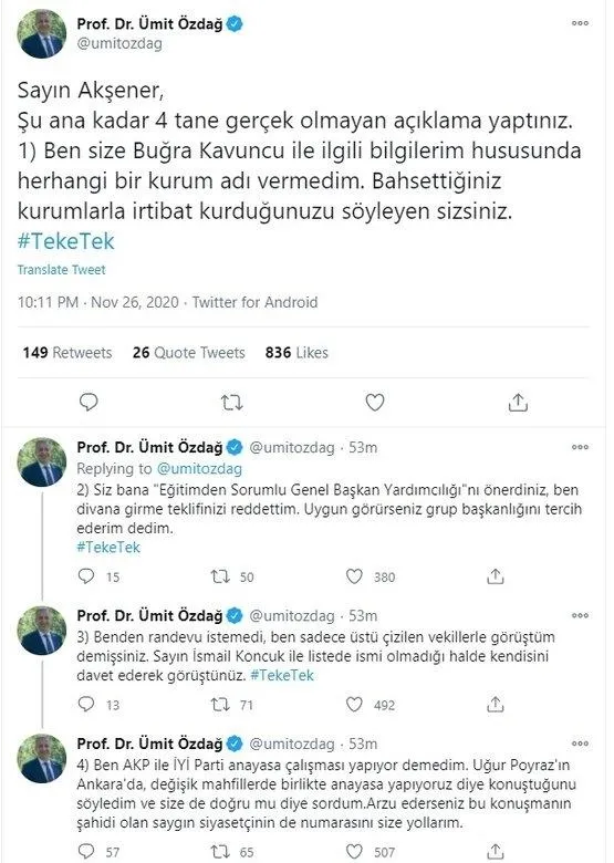 Akşener'in açıklamaları üzerine Prof. Dr. Ümit Özdağ Twitter'den açıklamalarda bulundu.