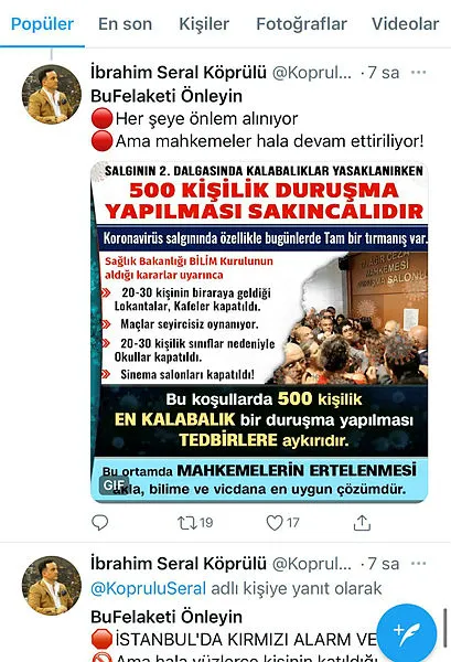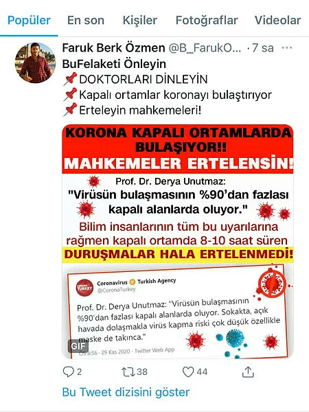 Manipülasyonlarıyla davayı uzatma çabalarını mahkeme dışına da taşıyan Oktarcılar, sosyal medyada kampanya başlattı. Twitter'da koronavirüse rağmen mahkeme gelmek zorunda bırakıldıkları yalanını paylaşan örgüt mensupları, Adalet Bakanlığı'nı da etiketleyerek TT olan algı operasyonları ile yargıya baskı oluşturmaya çalıştı. Sanıklar yalanlarını desteklemek için davanın görüldüğü mahkemeden değil de başka adliyeden eski, kalabalık görüntüler içeren fotoğraflar da kullandı.