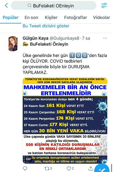 Bu kez sanıklar koronavirüs bahanesiyle mahkemeye gelmek istemediklerini bildirdi. Ancak mahkeme başkanı zaten tutuksuz sanıkların duruşmalara gelme zorunluluğunun kaldırıldığını belirterek, sadece mahkemede savunma yapmak isteyenlerin sırası geldiğinde duruşmaya gelmesinin yeterli olduğunu açıkladı.