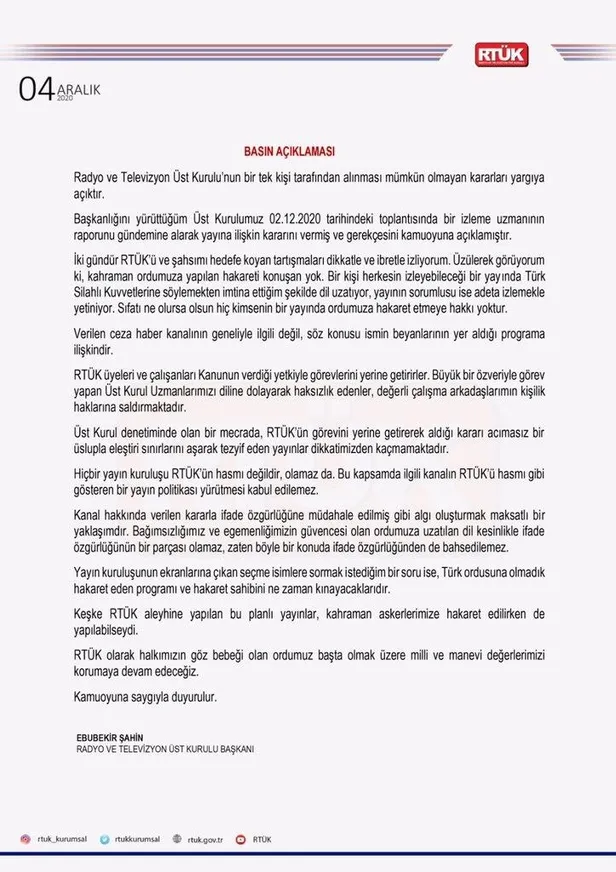 Radyo ve Televizyon Üst Kurulu (RTÜK) Başkanı Ebubekir Şahin, "Sıfatı ne olursa olsun hiç kimsenin bir yayında ordumuza hakaret etmeye hakkı yoktur. Verilen ceza, haber kanalının geneliyle ilgili değil, söz konusu ismin beyanlarının yer aldığı programa ilişkindir." ifadesini kullandı.