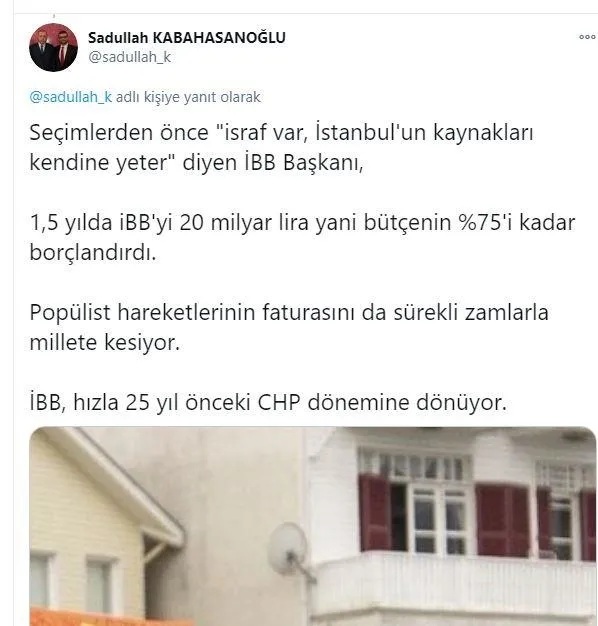 "Seçimlerden önce 'İsraf var, İstanbul'un kaynakları kendine yeter' diyen İBB Başkanı, 1,5 yılda iBB'yi 20 milyar lira yani bütçenin yüzde 75'i kadar borçlandırdı. Popülist hareketlerinin faturasını da sürekli zamlarla millete kesiyor. İBB, hızla 25 yıl önceki CHP dönemine dönüyor."