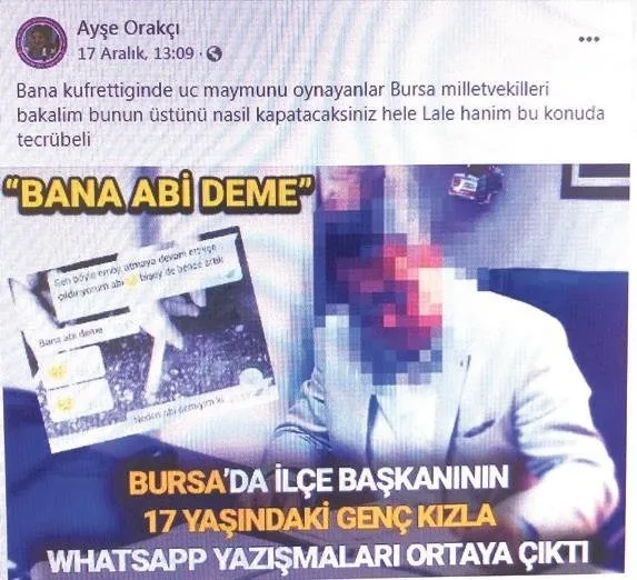 Bursa Osmangazi'de CHP İlçe Başkanı M.A'nın, henüz 17 yaşında olan genç bir kızı taciz ettiği ileri sürüldü. İlçeye bomba gibi düşen taciz iddiasında, M.A'nın gece geç saatlerde S. G'nin telefonuna çeşitli emojiler gönderdiği belirtildi. Başkanının gönderdiklerine anlam veremeyen genç kız, ne anlatmak istediğini sorduğunda ise hayatının şokunu yaşadı. Telefonuna bile (ismini tam yazarak) "M. Abi" diye kaydettiği kişinin kendisini taciz ettiğini anlayan S. G. olaya tepki gösterdi.