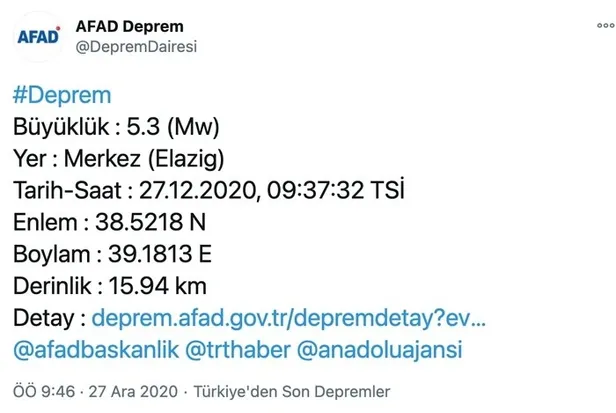 Elazığ'da 5,3 büyüklüğünde deprem meydana geldi. Afet ve Acil Durum Yönetimi Başkanlığının (AFAD) internet sitesinde yer alan bilgiye göre, saat 09.37'de merkez üssü Elazığ olan 5,3 büyüklüğünde deprem kaydedildi.