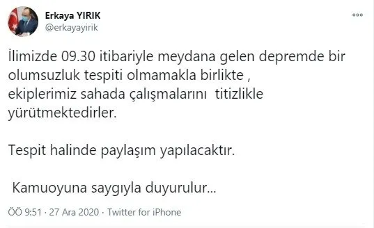 Elazığ Valisi Erkaya Yırık depremin ardından katıldığı canlı yayında "ekipler çalışmalarını sürdürüyor" dedi. Yırık şu ifadeleri kullandı: Şu ana kadar ekiplerimizin yapmış olduğu çalışmada onlara ulaşan olumsuz bir tespit yok. Olumsuz bir tespit olmamakla birlikte ekiplerimizi taramalarını sürüdürüyorlar. Herhangi bir tespit halinde bu durum vatandaşlarımızla paylaşılacak. Bize dünkü depremin ardından uyarı şeklinde bir bilgi yoktu ama burası 24 Ocak'taki depremin ardından hareketli bir bölge. Devletimizin o depremin yaralarını sarmaya çalışıyor.Deprem sırasında arkadaşlarımız AFAD, jandarma, UMKE takiplerini sürdürüyor. Şu ana kadar olumsuz bir kayıt yok. Bir tespit vuku bulursa kamuoyu ile paylaşacağız.