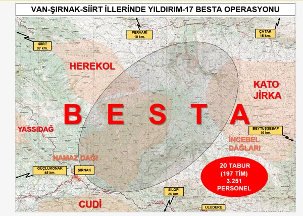 Kış üslenmesini gerçekleştiremeyen ve hareket kabiliyeti daralan, ülke içerisinde iletişimi ortadan kalkan bölücü terör örgütünün, bu kabiliyetini bir daha kazanmasını engellemek ve yurt içindeki terörist varlığını tamamen bitirmeye yönelik olarak; İçişleri Bakanlığınca Van Jandarma Asayiş Kolordu Komutanlığının sevk ve idaresinde Van, Şırnak ve Siirt illerinde başlatılan "YILDIRIM-17 BESTA" Operasyonu devam etmektedir.