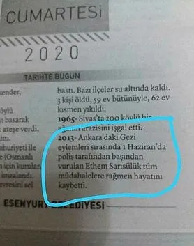 Takvimin 31 Mayıs yaprağında ise Gezi Parkı eylemlerinin tüm ülkeye yayıldığına ilişkin ifadeler yer alırken, 28 Haziran kısmında ise terör örgütü PKK ile mücadele amacıyla Lice'de Kalekol yapılmasını protesto edenlere, askerler tarafından müdahale edildiği ve bir kişinin hayatını kaybettiği aktarıldı.