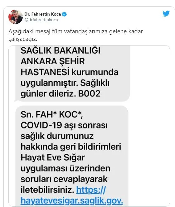 "Bireysel olarak yapabileceğimiz, ondan daha önemlisi var; bir defa tedbirlere uymak. Maske, mesafe, temizlik olmazsa olmazımız. Aslında bugünlere, bu rakamlara gelebildiysek vatandaşlarımızın uyumuyla oldu. Vatandaşlarımız eğer bu ekibin önemli bir parçası olmakta ısrarlı olurlarsa ve kurallara uyma konusunda özveriyi sürdürürlerse biz iyi günleri hep birlikte konuşuruz ve düşük rakamları yerinde tutabiliriz. Vatandaşlarımızın aşılama konusunda da özverilerini sürdürmeleri ve risk grubunda olan herkesin aşı olmasını ısrarla öneriyorum. Çünkü şu ana kadar bilimsel anlamda etkinliği gösterilmiş maske ve mesafenin dışında elimizde bir aşı var. Virüs için etkili olduğu bilinen bir ilaç çıkana kadar şu an aşıya ihtiyacımız var. Vatandaşlarımız şunu unutmasınlar; aşılanmamız sadece kendi sağlığımız için değil, toplum sağlığı için önemli. Çünkü toplumun en az yüzde 60'ını aşılama hedefimiz var. Bu rakama ulaşmak da halkın aşılamaya talebiyle olacaktır."